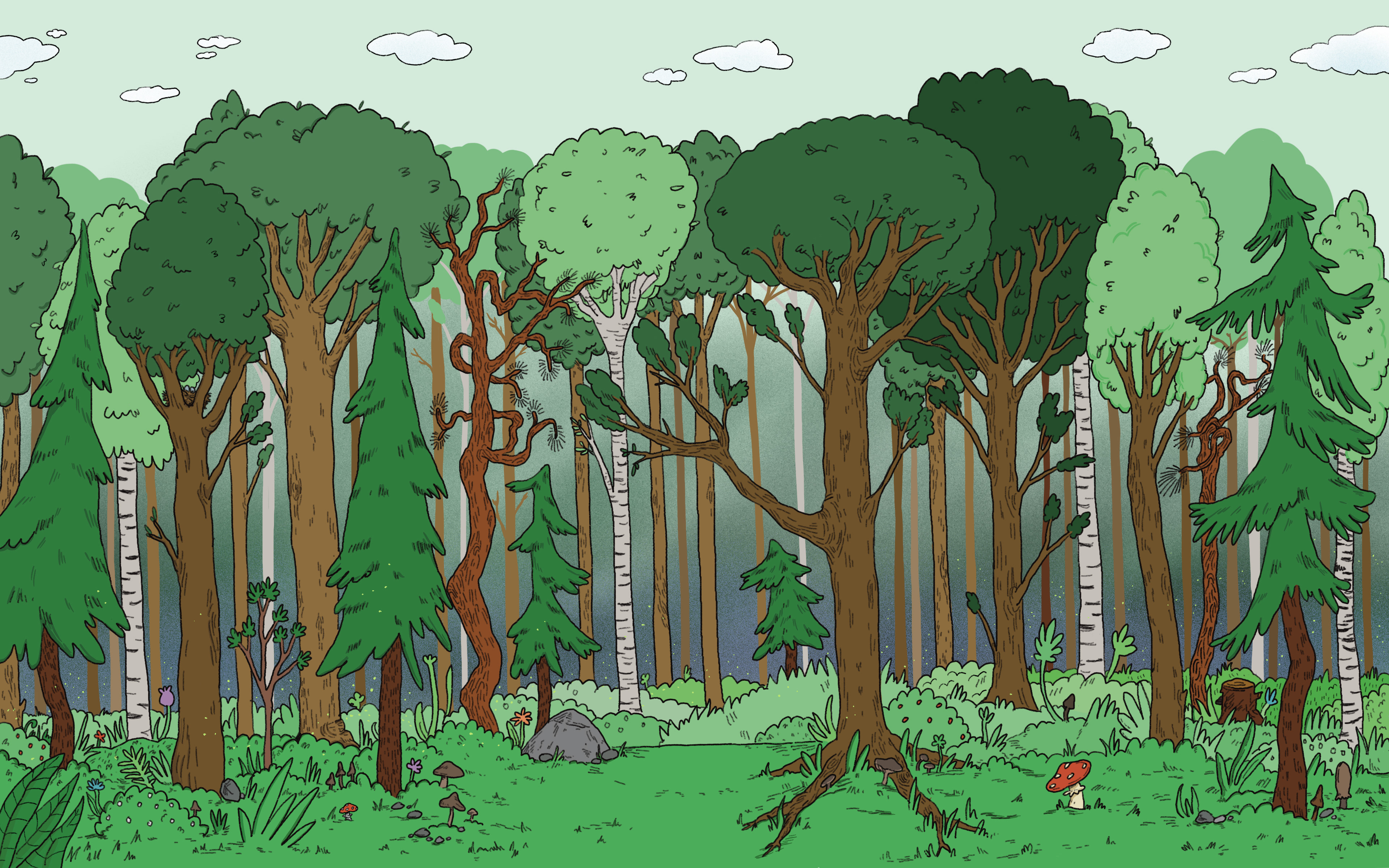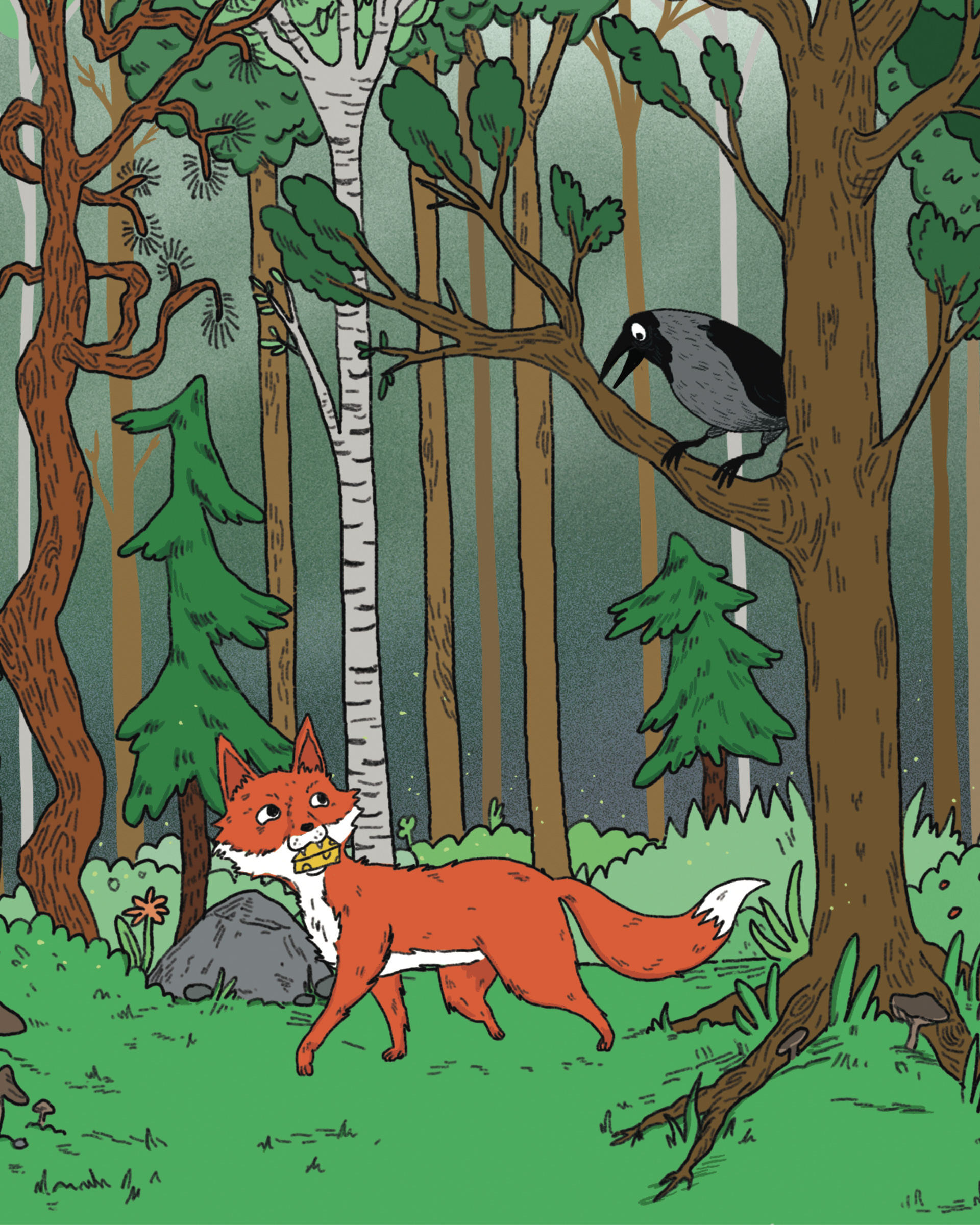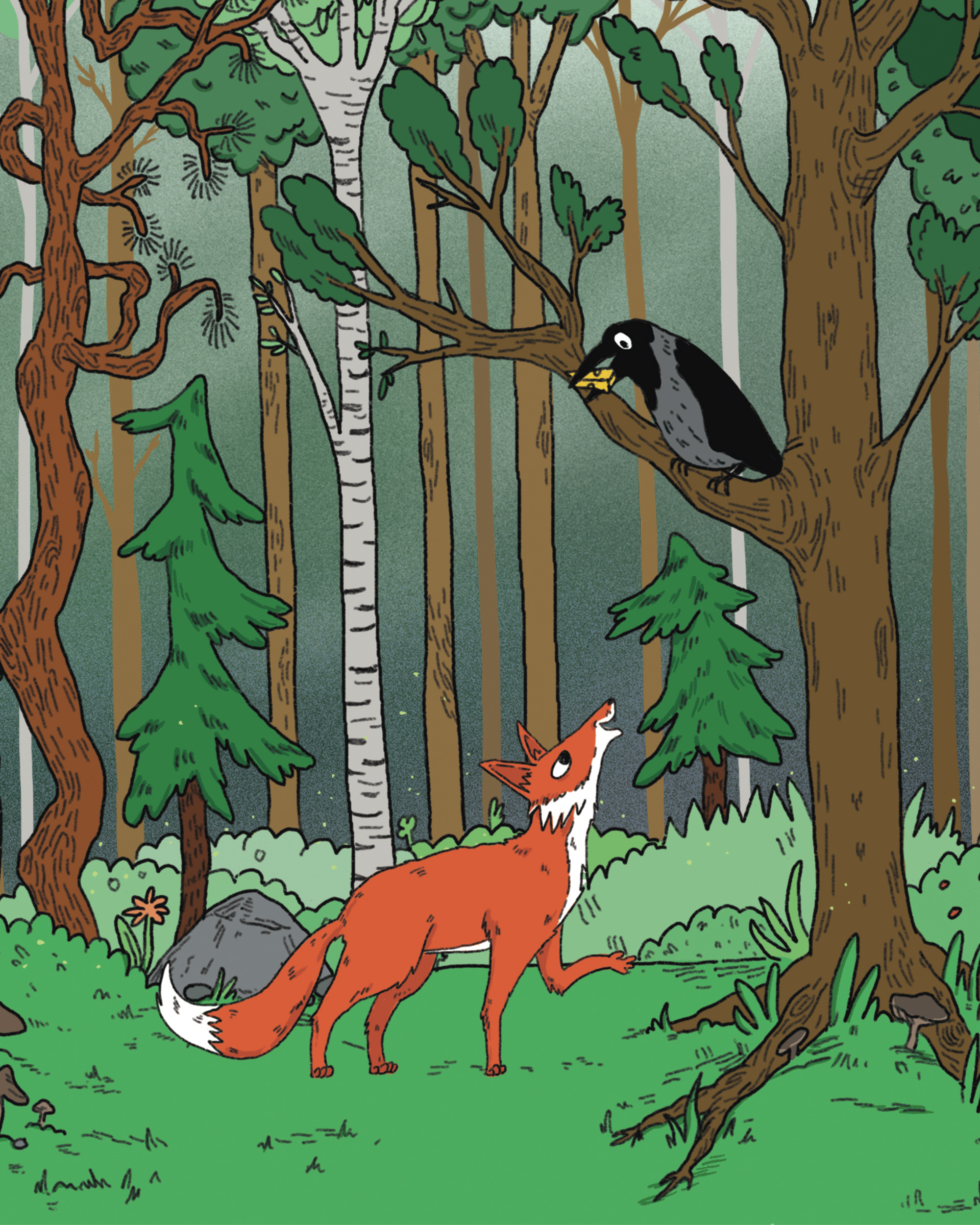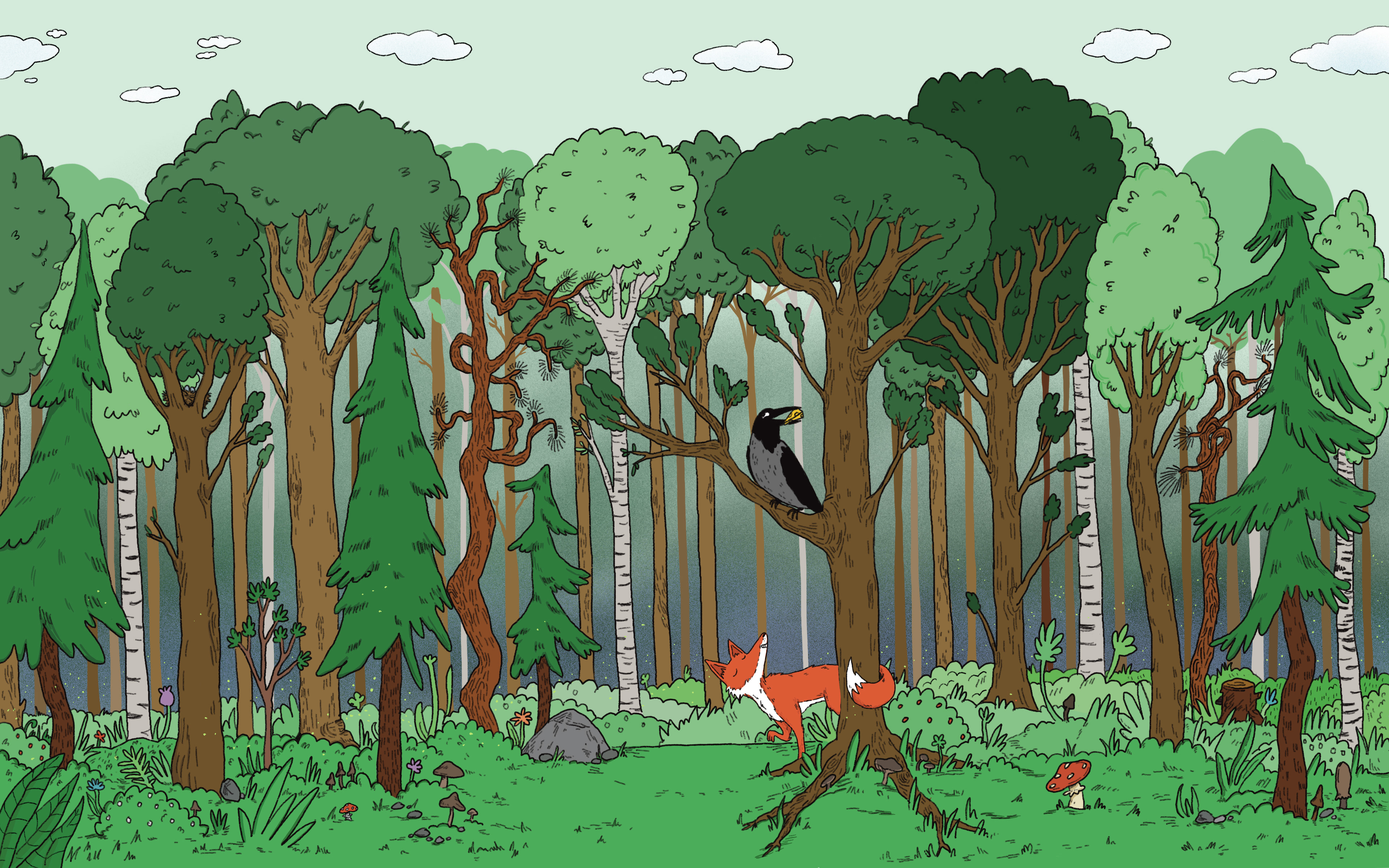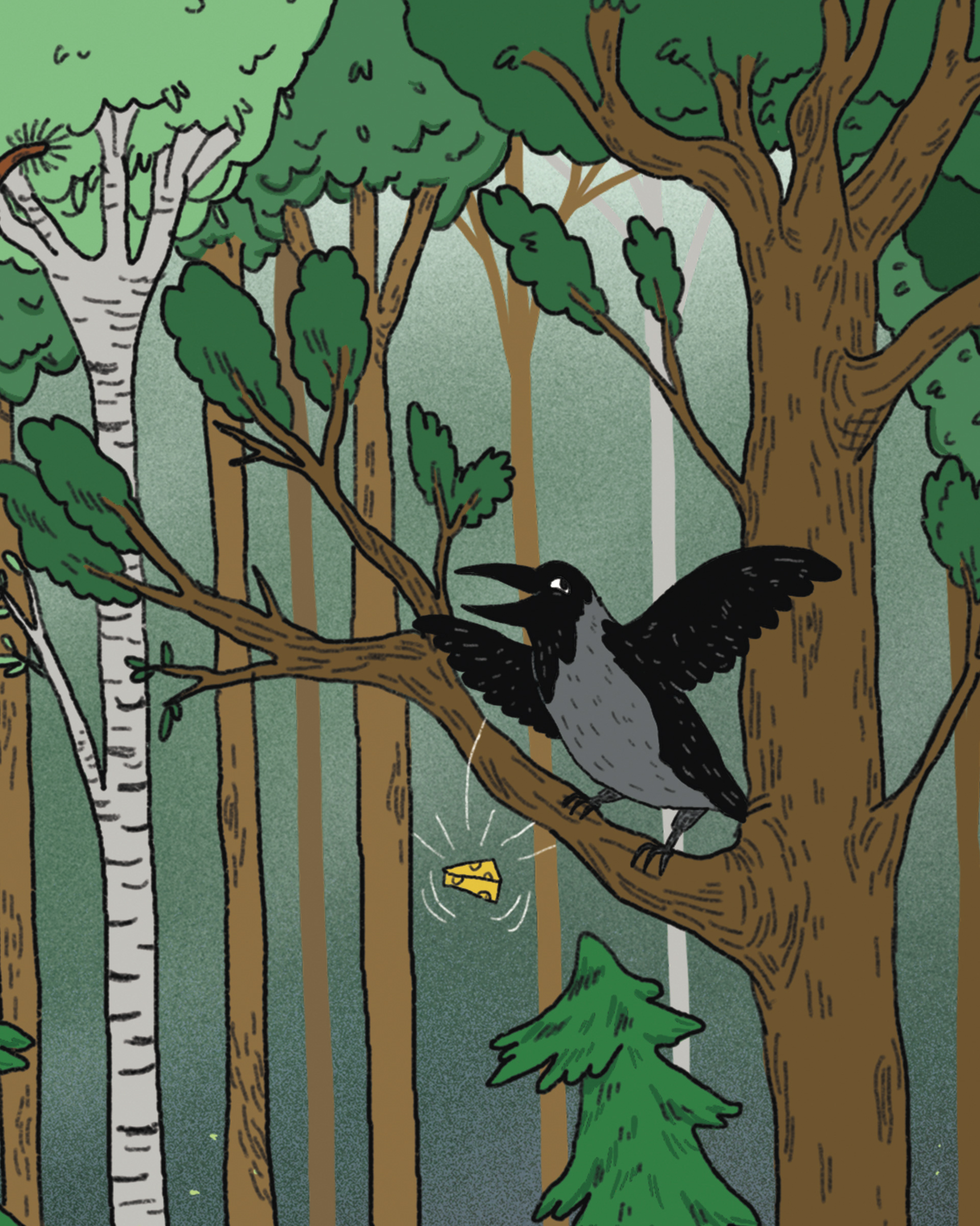 Illustrasjon for et eventyr i Gyldendals digitale læreverk for barnehage og barneskole, Salaby. Eventyret handler om reven og kråka.